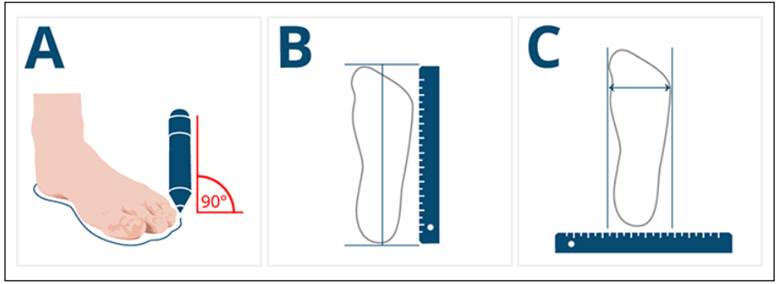 Sau đó, bạn dùng bút vẽ theo khung bàn chân của mình (A). Cuối cùng, bạn hãy đo khoảng cách 2 điểm xa nhau nhất của bàn chân theo chiều dài (B) và khoảng 2 điểm xa nhau nhất của bàn chân theo chiều rộng trên tờ giấy (C).
